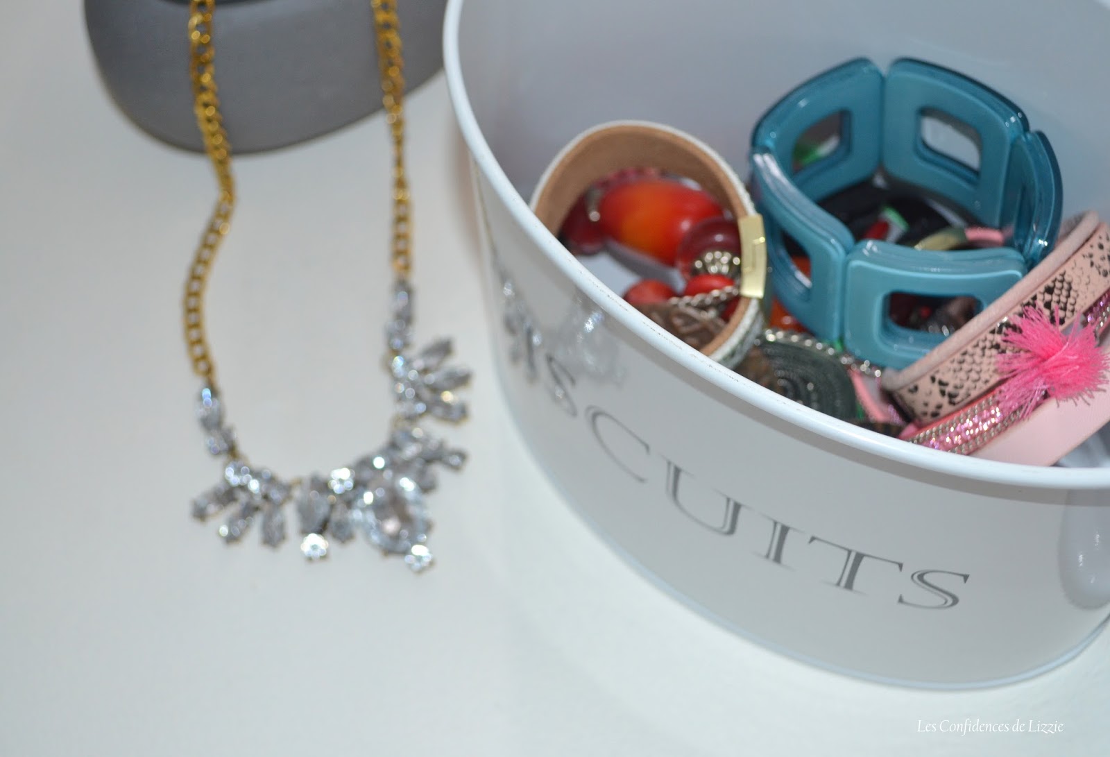 La boîte à biscuits devient une boite à bijoux, pour des bijoux plus volumineux. Oui encooore me direz-vous. Sa contenance permet d’y ranger de nombreuses choses comme des sautoirs. Bizarrement même si « Biscuits » est inscrit dessus, il trouve lui aussi très facilement sa place sur ma commode.
