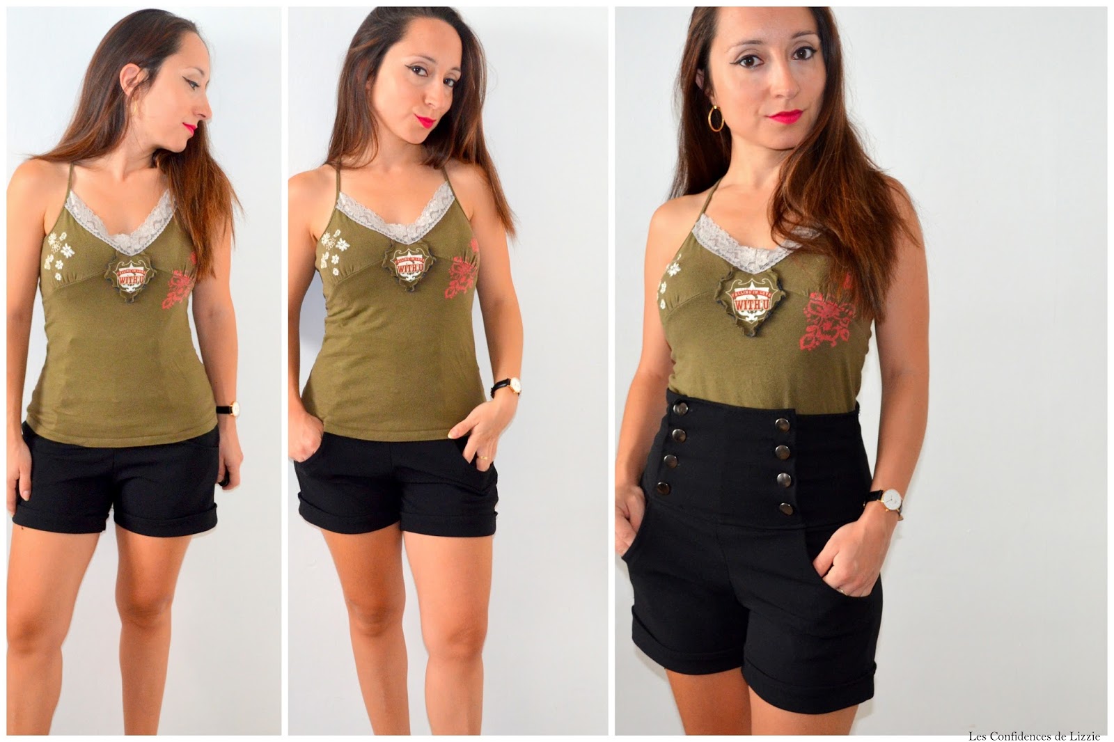 Qu'est ce qu'il est beau ce short avec les boutons je le trouve très classe et j'adore les tailles hautes également ! Le t-shirt féline mais divine est très beau et originale 🙂 Pour les looks ils sont tous très jolis mais j'ai un coup de coeur pour le premier avec le débardeur a l'intérieur du short 🙂