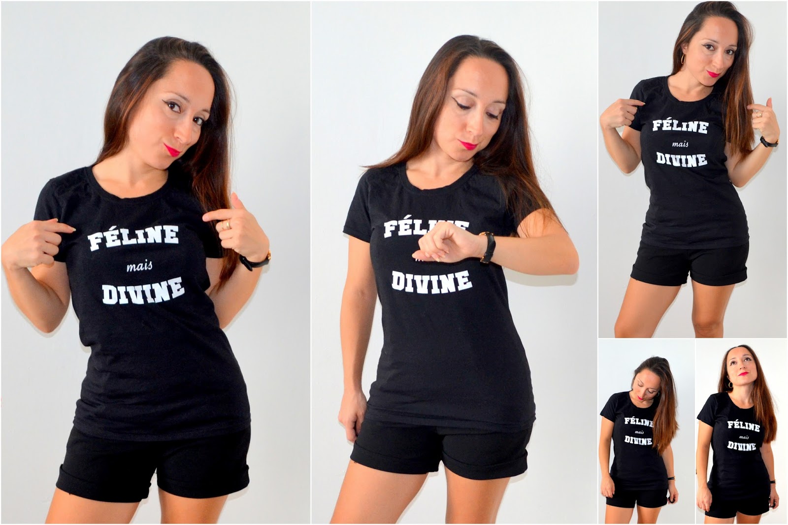 tee-shirts à messages issus du site Vsible.com. L’une est estampillé Féline mais divine tandis que l’autre est tagué Laisse tes mains sur mes hanches. Féline mais Divine est en noir et blanc. Je le