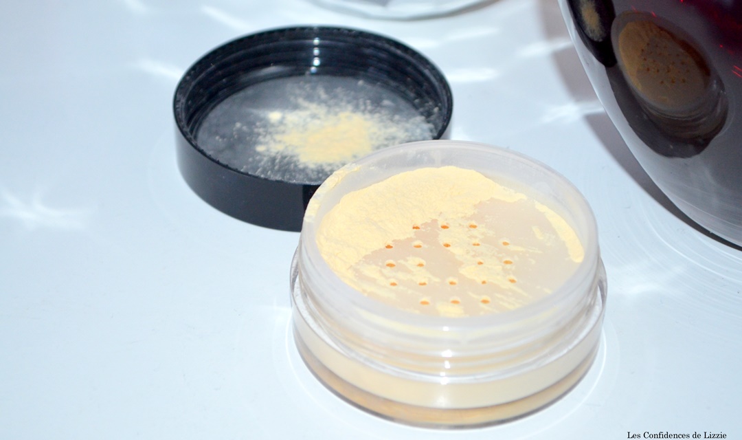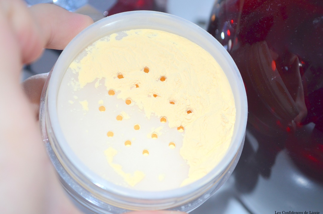 A l’ouverture du pot en plastique, on découvre un tamis aux trous ni trop larges ni trop fins néanmoins la poudre se retrouve immédiatement sous le couvercle. Il manque un petit élément afin de quantifier correctement la poudre. La poudre est teinte banane. Elle est fine et volatile cependant elle se fixe immédiatement sur le pinceau. Ouf !