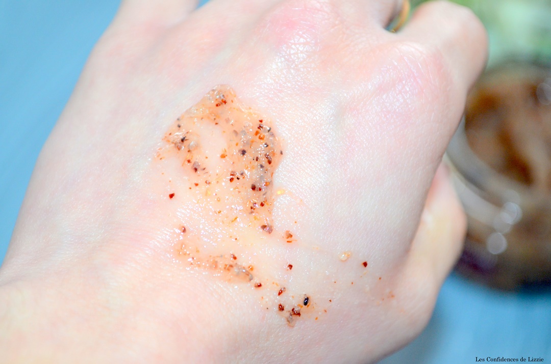 La texture est onctueuse, crémeuse et huileuse. Les grains sont de taille normale, cela facilite un gommage doux mais efficace. Son parfum est sucré et modéré. La peau garde un léger film parfumé et protecteur.
