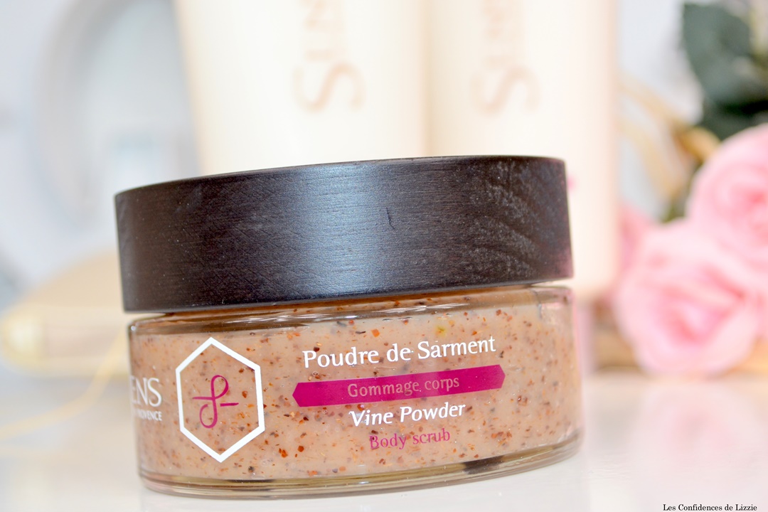 Présenté dans un pot de 100ml, on retrouve sur le couvercle le logo Sens de Provence. Ce gommage corps est formulé à base de poudre de sarment de vigne et poudre de pépin de raisin, de vitis vinifera et d’huile d’olive bio. Les serments sont d’excellents exfoliants mécaniques naturels qui permettent l’élimination des cellules mortes.