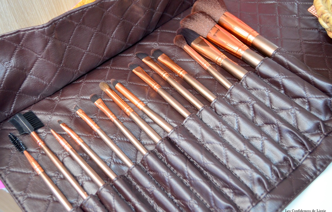 Tout d’abord, j’ai reçu le coffret dans une adorable pochette noire épaisse. Les pinceaux s’y trouvent protégés. L’ouverture est simple et l’étui se ferme aisément. A l’ouverture, on découvre 15 pinceaux au design épuré mais chic avec leur touche de gold. Les pinceaux semblent de qualité, ils sont doux et les poils sont nombreux. La première impression est excellente.
