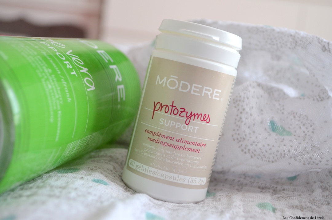 Dans une bouteille de 500ml, l’Aloe vera de Modere est idéale pour un mois de detox légère et sans contrainte. La bouteille est pratique et se conserve au frigo. J’adore le prendre à jeun, il est doux, agréable et bon. Légèrement sucré, l’Aloe Vera Support se prend sans problème. Aloe Vera de Modere est une association intéressante d’aloe vera 100 % bio, de jus de fruits naturels et d’infusions. Les processus de micronisation et de préservation permettent un produit le plus frais que possible et de persévérer les ingrédients. Je suis fan de cette boisson depuis plus d’un an. Concernant Protozymes, vous avez sûrement vu des publicités sur certains produits enrichis en probiotiques ? Les probiotiques et les prébiotiques ont un rôle déterminant sur le système immunitaire et le confort intestinal. Ce n’est plus à prouver. Protozymes permet de retrouver un bien-être digestif incontestable. Il m’accompagne depuis de nombreux mois. Après l’avoir testé en cure durant 2 mois, je suis passée en phase d’entretien. J’en suis ravie !